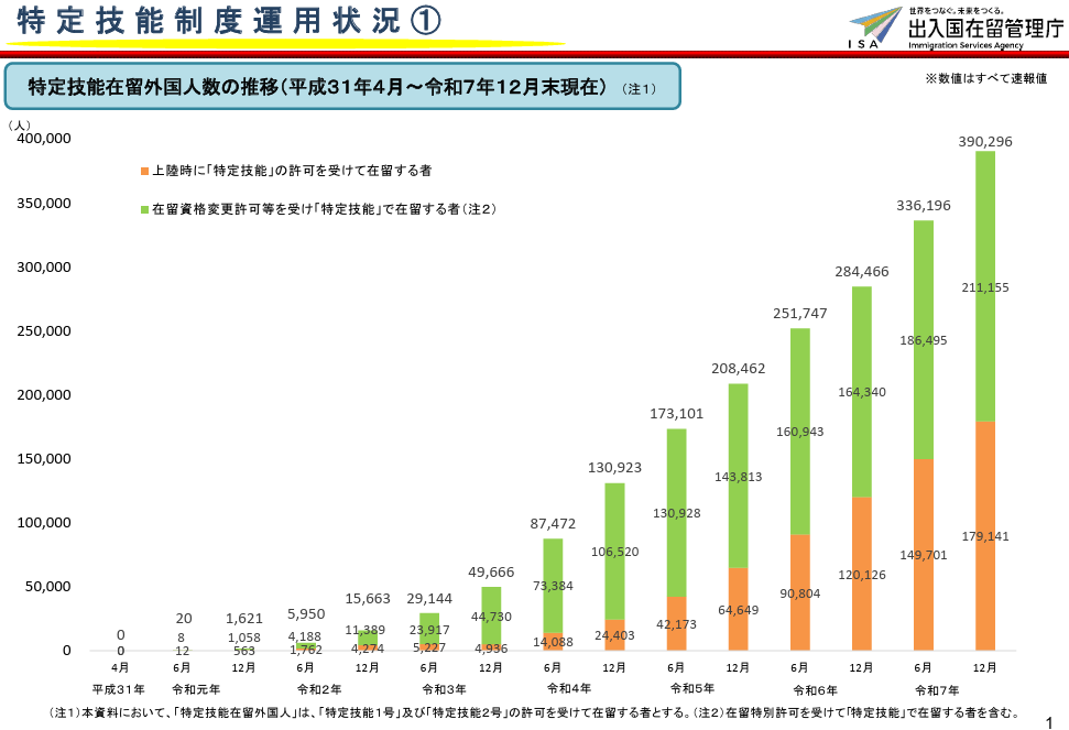 一時停止措置の発表と同日(2026年3月27日)に、2025年12月末時点の在留外国人数の統計データも公表されています。それによると、過去最高を更新するとともに初めて400万人を超え、総計4,125,395人(前年末比9.5%増)、中でも、増加数、前年比共に大きく伸びている在留資格が「特定技能」です。(1号、2号合計で390,296人、前年差+105,830人、前年比+37.2%)専門的・技術的分野の外国人を積極的に受入れるという政府の方針に基づき、人手不足が見込まれている産業分野においては今後も拡大が予想されます。